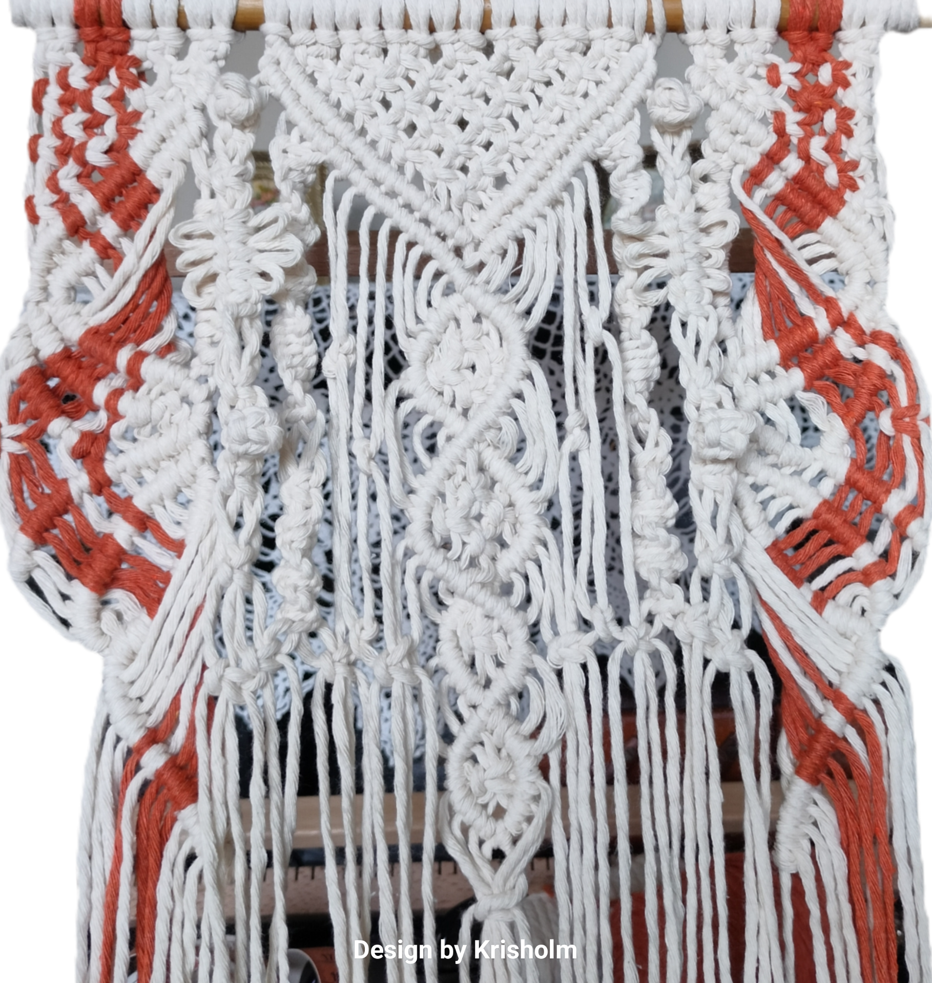 Aloitin makrametyön tietämättä mitä siitä tekisin. Kuvio on villisti ja vapaasti saanut muotoutua työn edetessä. Löysin kauniin patinoituneen laudan varastosta, saas nähdä onko lopputulos ampeli, hylly vai raanu?