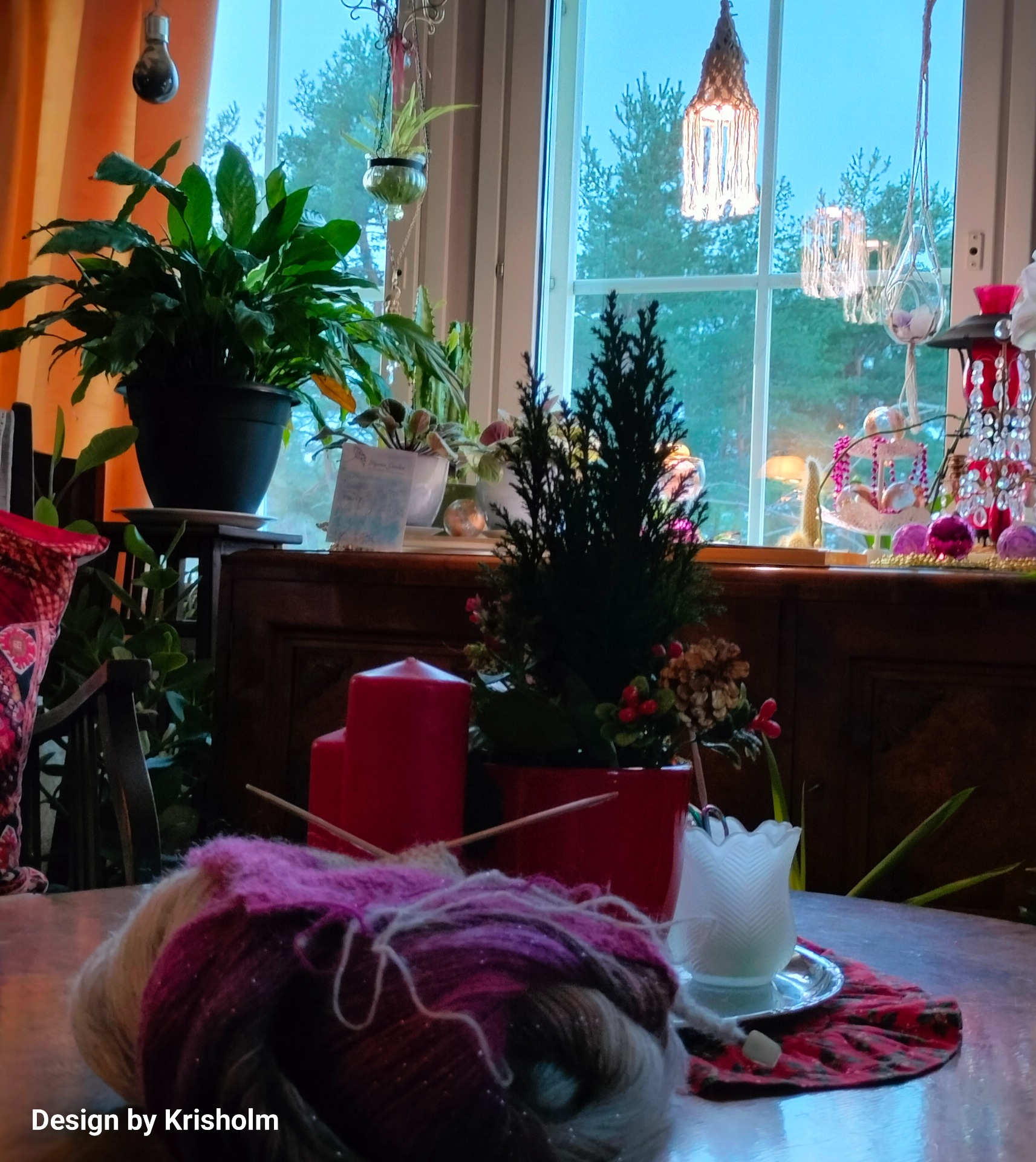 Valitsin siis monivärisen Alize Batik langan, jota minulla löytyi kimalteisena, sekä ilman metallikuitua.